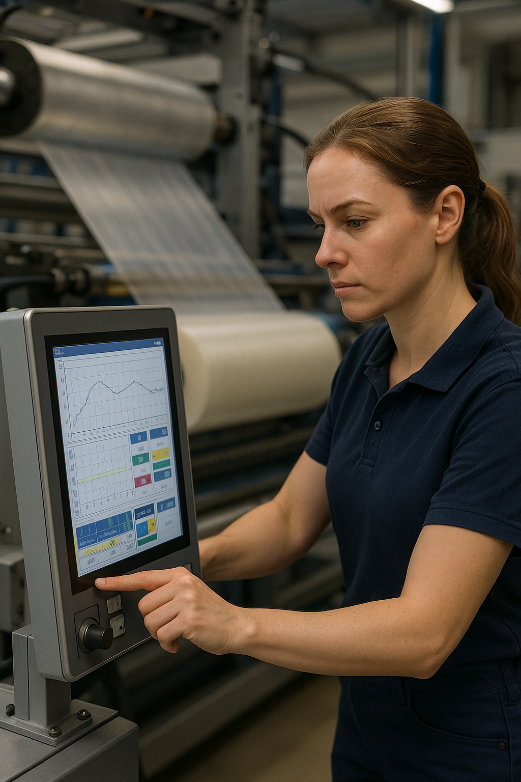 Darüber hinaus schulen wir Sie in der Feinjustage sowie in Sonderfunktionen wie Temperaturregelung, Bahnkantensteuerung, Randbeschnitt oder Drucküberwachung. Durch gezielte Praxisübungen mit Ihren eigenen Materialien und Prozessdaten wird das Gelernte sofort anwendbar.